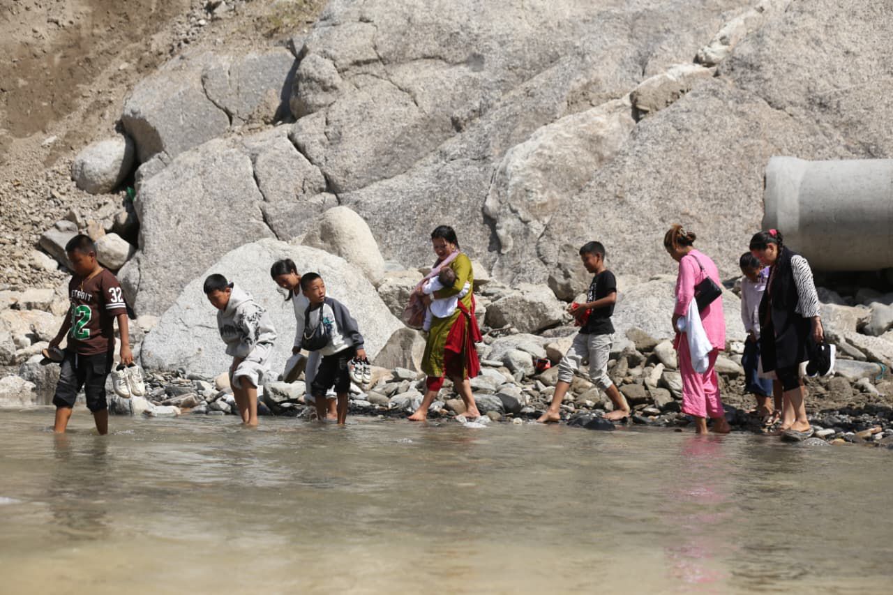 Sabita Lama, along with her children and siblings, crossed a section of the BP Highway in Chaukidanda, wading through the Roshi River, which, till last Friday, was a diversion road.