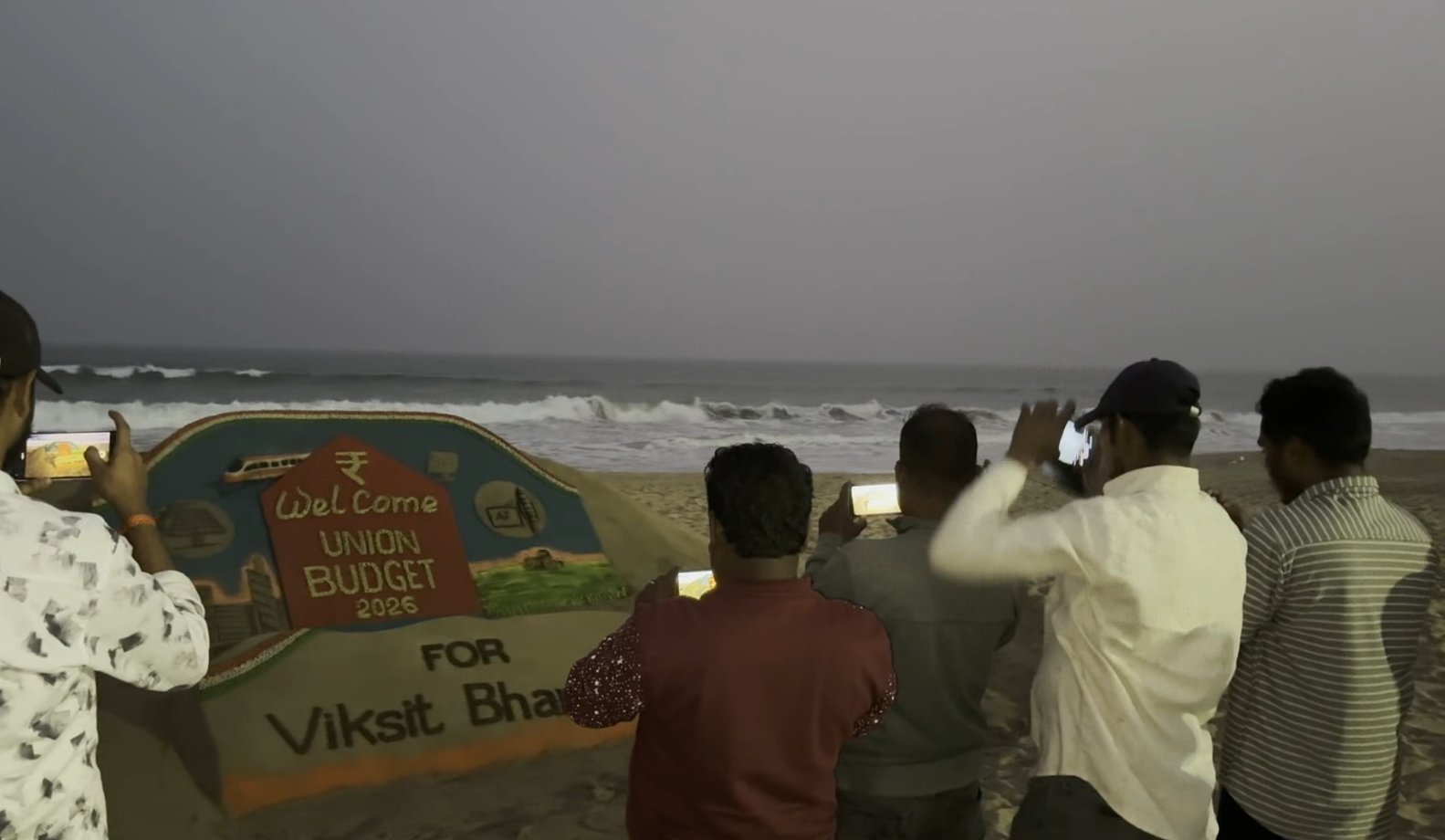 The sculpture carries the messages “Welcome Union Budget 2026” and “For Viksit Bharat.” It also depicts India’s various developments, reflecting growth in areas such as agriculture and infrastructure. Several visitors gathered at the beach to view the sculpture and take pictures.
