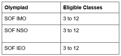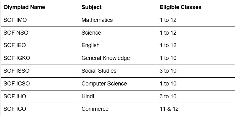 The following table shows the list of official Olympiad exams, subjects, and classes eligible for the exams: