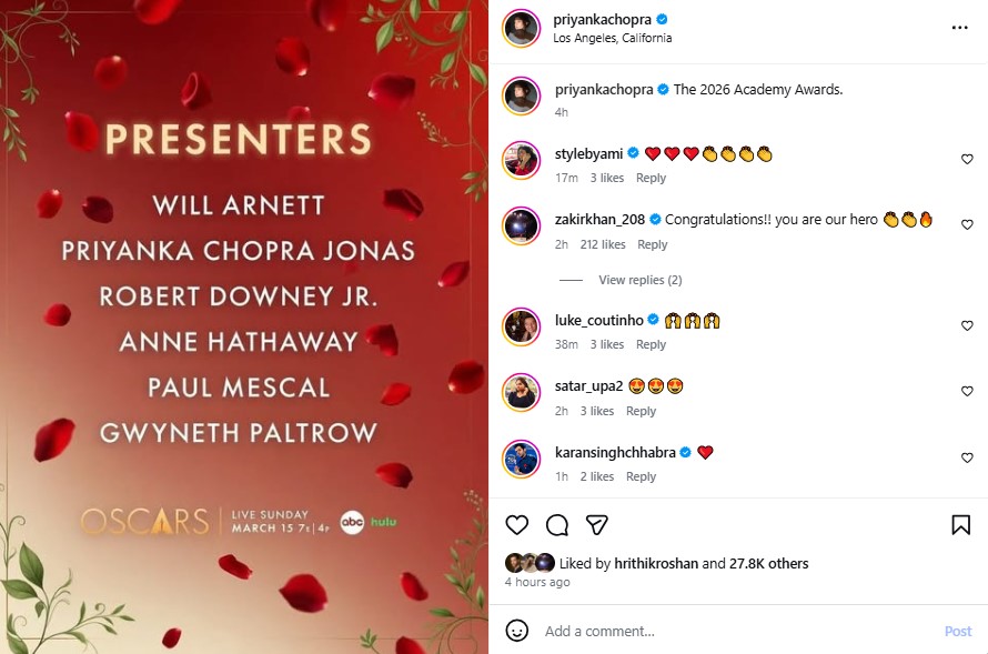 In addition to Priyanka, the newly announced presenters include Robert Downey Jr., Anne Hathaway, Paul Mescal, Will Arnett, and Gwyneth Paltrow.