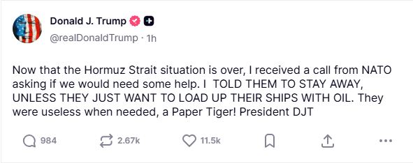 “Now that the Hormuz Strait situation is over, I received a call from NATO asking if we would need some help. I TOLD THEM TO STAY AWAY, UNLESS THEY JUST WANT TO LOAD UP THEIR SHIPS WITH OIL. They were useless when needed, a paper tiger!” Trump posted on his Truth Social platform.