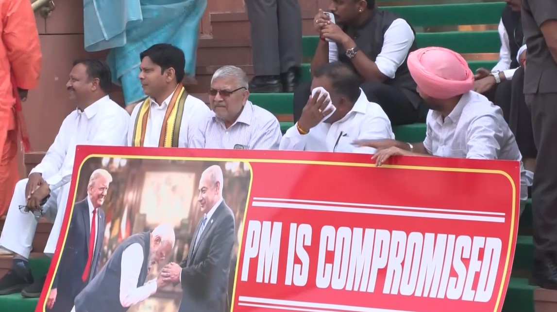 They were seen holding posters and a banner which read ‘PM is Compromised’. The banner featured pictures of PM Modi with US President Donald Trump and Israeli PM Benjamin Netanyahu.