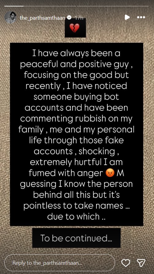 Samthaan, on Tuesday, took to his Instagram Story to share how he has been facing a wave of online negativity, including alleged personal attacks aimed at him and his family through fake accounts, which has left him deeply upset. The actor also went on to suggest that he may have an idea about who is behind the activity, but chose not to name anyone publicly.