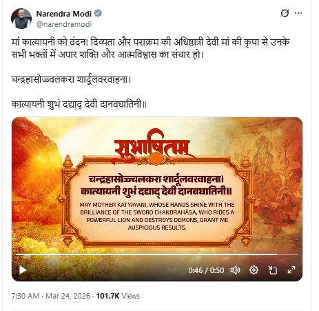 New Delhi [India], March 24 (ANI): Prime Minister Narendra Modi on Tuesday extended greetings to devotees on the occasion dedicated to Maa Katyayani and shared a Sanskrit subhashitam, invoking the Goddess’s blessings for strength and confidence.