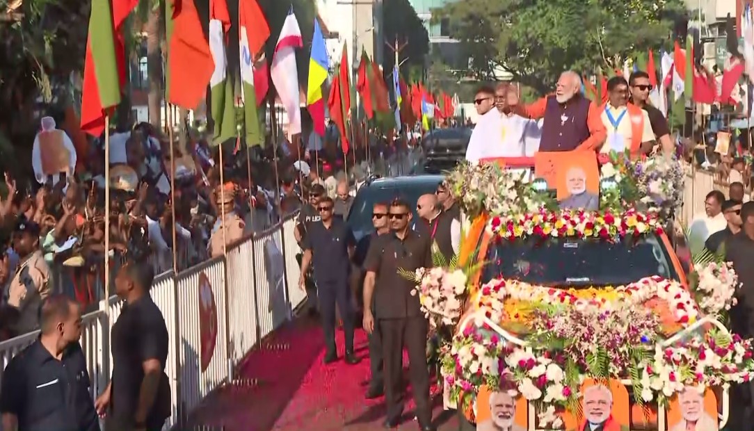 Puducherry [India], April 3 (ANI): With just a week left for the Puducherry Legislative Assembly polls, Prime Minister Narendra Modi held a large roadshow from Ansari Duraisamy Road to Kamaraj Salai in the Union Territory.