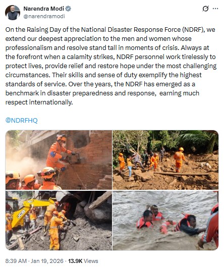 “On the Raising Day of the National Disaster Response Force (NDRF), we extend our deepest appreciation to the men and women whose professionalism and resolve stand tall in moments of crisis. Always at the forefront when a calamity strikes, NDRF personnel work tirelessly to protect lives, provide relief and restore hope under the most challenging circumstances,” the PM wrote in the post.