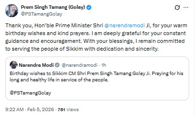 “Thank you, Hon’ble Prime Minister Shri @narendramodi Ji, for your warm birthday wishes and kind prayers. I am deeply grateful for your constant guidance and encouragement. With your blessings, I remain committed to serving the people of Sikkim with dedication and sincerity,” the CM replied.