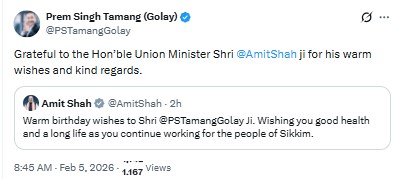Subsequently, Union Home Minister Amit Shah also extended birthday greetings to the Sikkim Chief Minister, wishing him “good health and long life.”