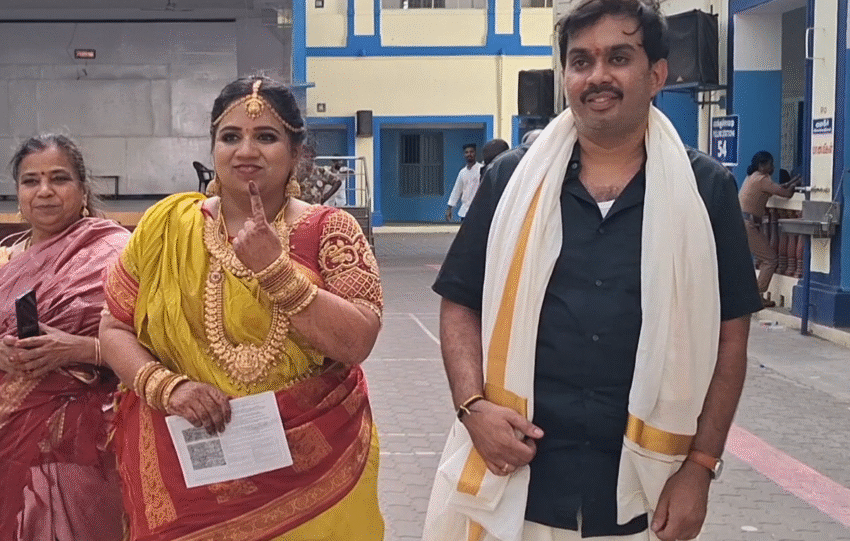 Amid a visible enthusiasm among the voters, a newly married couple arrived at a polling booth in Tirupathur to cast their votes.
