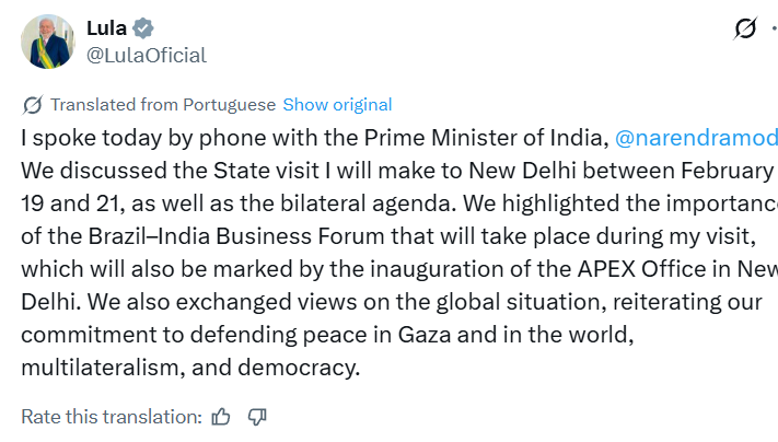 In a post on X, Lula shared details of the discussion, noting his planned state visit to New Delhi from February 19 to 21 to advance the bilateral agenda between the two nations.