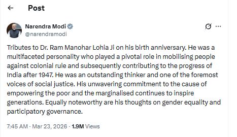 On X, he said, “On the birth anniversary of the great freedom fighter, eminent socialist thinker, and pioneer of ‘Sapta Kranti’, Dr. Ram Manohar Lohia, humble tributes. His dedication to social justice, equality, and the national language Hindi will forever inspire us to build a strong and self-reliant India.”