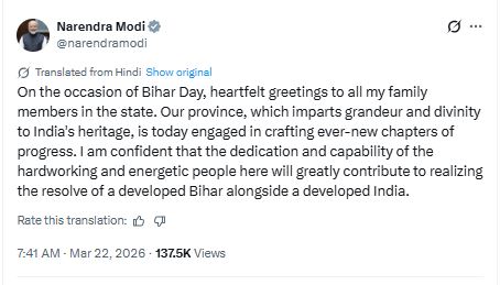 On X, he wrote, “On the occasion of Bihar Day, heartfelt greetings to all my family members in the state. Our province, which imparts grandeur and divinity to India’s heritage, is today engaged in crafting ever-new chapters of progress. I am confident that the dedication and capability of the hardworking and energetic people here will greatly contribute to realizing the resolve of a developed Bihar alongside a developed India.”