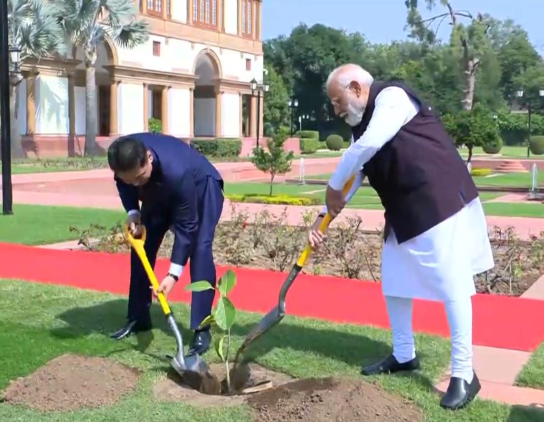 New Delhi [India], October 14 (ANI): Prime Minister Narendra Modi met the President of Mongolia, Khurelsukh Ukhnaa, here in the national capital on Tuesday. The two leaders exchanged pleasantries and also planted a sapling.