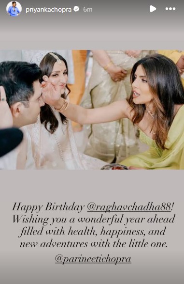 Taking to her Instagram story, Priyanka shared a picture with Raghav and Parineeti from their wedding festivities. In her caption, the actor extended a special message.