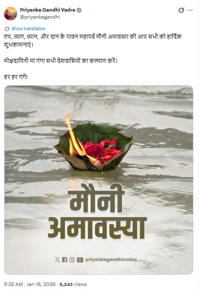 “Heartfelt greetings to all of you on the sacred festival of Mauni Amavasya, dedicated to austerity, sacrifice, meditation, and charity,” she wrote.