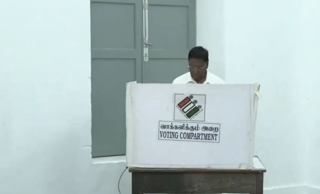 Puducherry [India], April 9 (ANI): Polling is underway in Puducherry, and former Chief Minister and Congress leader V Narayanasamy cast his vote at the polling station at VOC Govt School on Thursday.