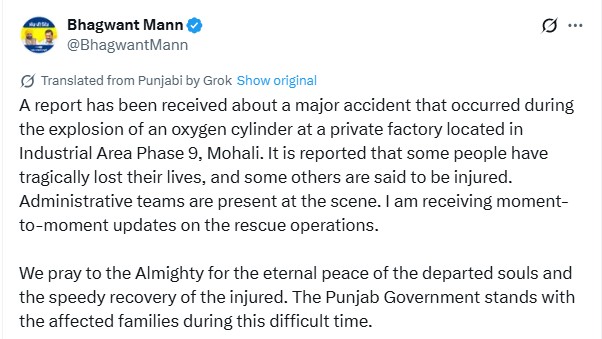 In a post on X, the Chief Minister said, “A report has been received about a major accident that occurred during the explosion of an oxygen cylinder at a private factory located in Industrial Area Phase 9, Mohali. It is reported that some people have tragically lost their lives, and some others are said to be injured. Administrative teams are present at the scene. I am receiving moment-to-moment updates on the rescue operations.”