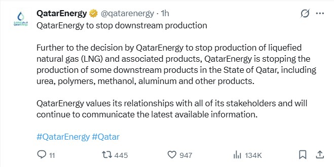 Posting on its X account, the company said, “Further to the decision by QatarEnergy to stop production of liquefied natural gas (LNG) and associated products, QatarEnergy is stopping the production of some downstream products in the State of Qatar, including urea, polymers, methanol, aluminum and other products.”