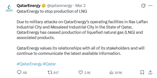 Posting on its X account, the company said, “QatarEnergy to stop production of LNG. Due to military attacks on QatarEnergy’s operating facilities in Ras Laffan Industrial City and Mesaieed Industrial City in the State of Qatar, QatarEnergy has ceased production of liquefied natural gas (LNG) and associated products.”