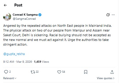 Meghalaya Chief Minister Conrad K Sangma, in a post on X, wrote, “Angered by the repeated attacks on North East people in Mainland India. The physical attack on two of our people from Manipur and Assam near Saket Court, Delhi, is sickening. Racial bullying should not be accepted as the new normal, and we must act against it. Urge the authorities to take stringent action.”