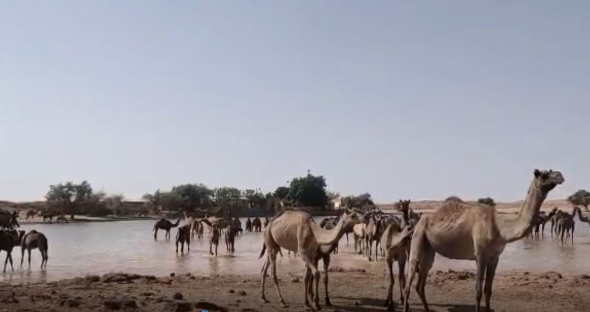 Tormented by the intense sun and gusts of hot wind, people are frequently spotted wandering about in search of cold water. Even the “ships of the desert”, camels, are seeking respite from the severe heat by gathering at a local pond to cool off.