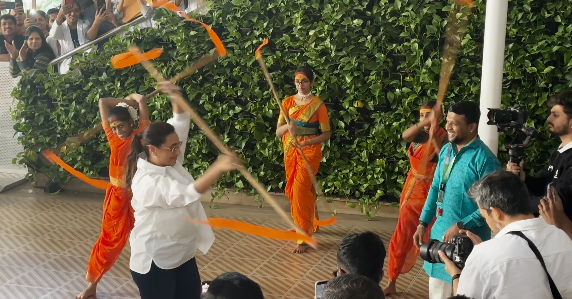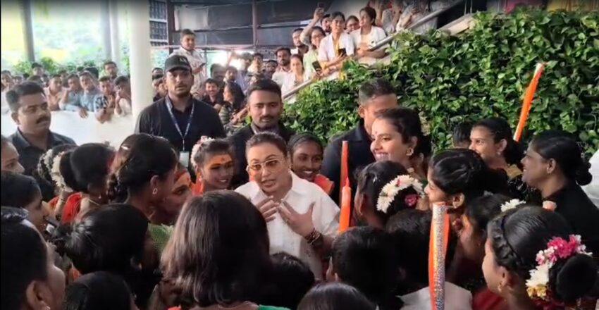 The actress had a greet-and-meet session with her young fans at DY Patil Medical College, who were dressed in traditional attire. The girls wore saffron sarees while holding bamboo sticks and a shield, symbolising the bravery and empowerment of women in today’s world.