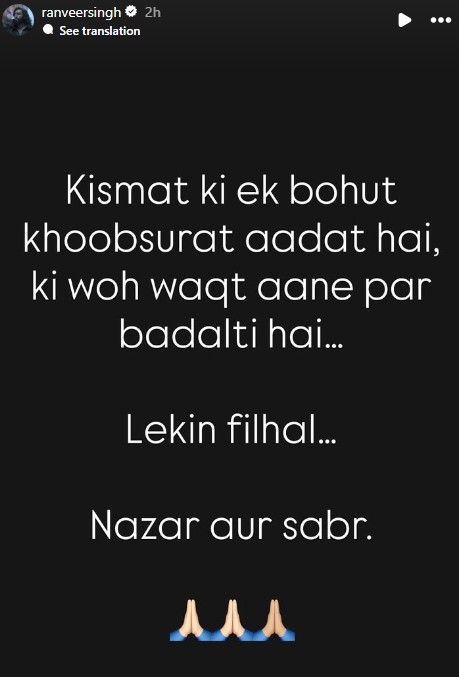 Taking to his Instagram handle, Ranveer shared a quote about the beauty of fate, while hinting that, for now, he is choosing to live with “nazar” (faith) and “sabr” (patience).