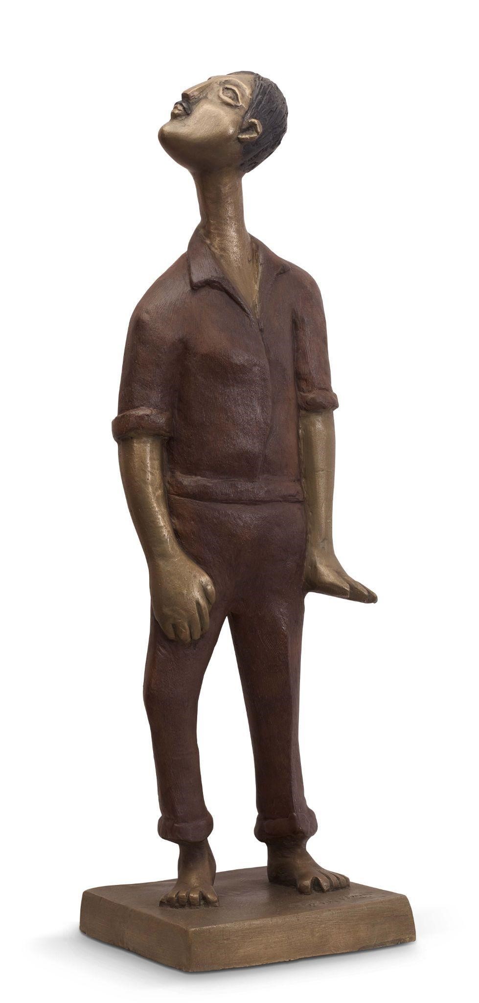 Lot No. 28, Untitled (Edition of 9) by Ram Kumar, is a bronze sculpture. The elongated human figure is standing still with its head tilted upward. It reflects themes of solitude, contemplation, and the inner emotional state of modern life, which are central to Ram Kumar’s work.