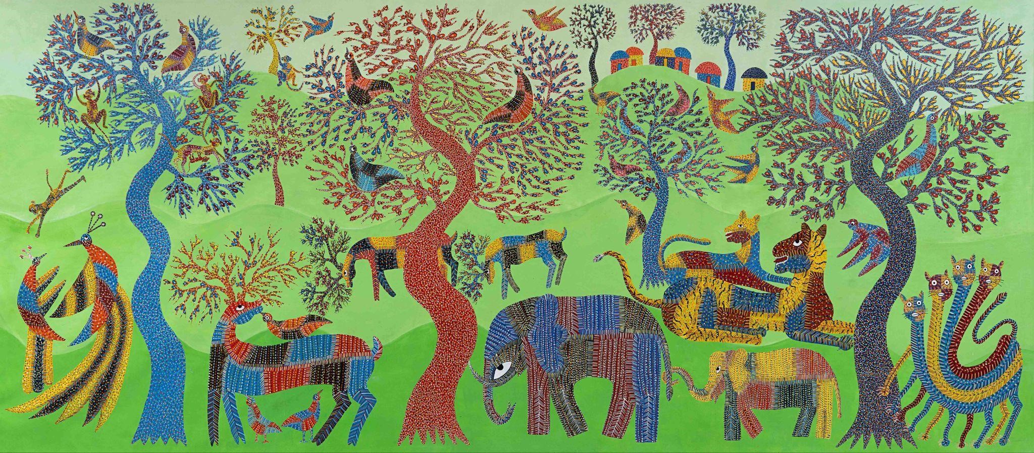 Lot no. 271 features Untitled (Life Tribe and Forest) by Anand Shyam, an expansive acrylic on canvas. Known for his vibrant visual narratives rooted in Gond traditions, Shyam’s work reflects a harmonious relationship between tribal life and the natural world. The painting bursts with vibrant colours, showing animals, trees, and village life woven together in a joyful, folk-art style.