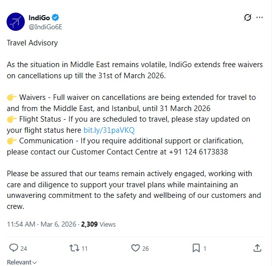 Indigo in a post on X mentioned a Travel Advisory which said, “Full waiver on cancellations are being extended for travel to and from the Middle East, and Istanbul, until 31 March 2026. If you are scheduled to travel, please stay updated on your flight status here http://bit.ly/31paVKQ.