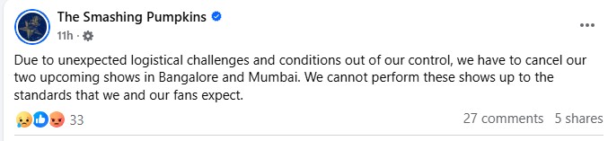 “Due to unexpected logistical challenges and conditions out of our control, we have to cancel our two upcoming shows in Bangalore and Mumbai. We cannot perform these shows up to the standards that we and our fans expect,” The Smashing Pumpkins wrote.