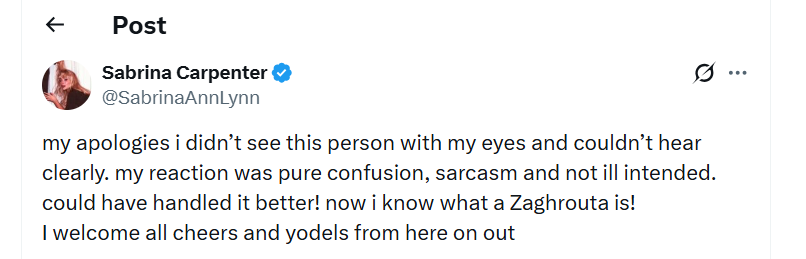 Responding to the backlash, Carpenter shared a message on X and offered a public apology. Admitting her reaction came from “pure confusion” and saying there was no bad intent behind it, she wrote, “my apologies i didn’t see this person with my eyes and couldn’t hear clearly. my reaction was pure confusion, sarcasm and not ill intended. could have handled it better! now i know what a Zaghrouta is!”