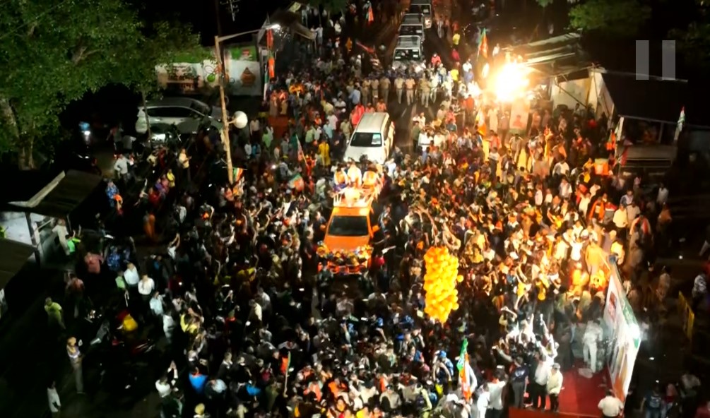 A sea of supporters surrounded the Home Minister as his caravan slowly moved through crowded streets with only saffron colour in sight.