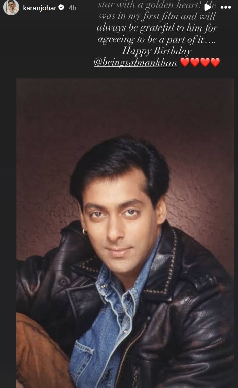 “Happy 60 to this mega movie star with a golden heart! He was in my first film and will always be grateful to him for agreeing to be a part of it. Happy Birthday, Salman Khan,” wrote Karan Johar on his Instagram story.