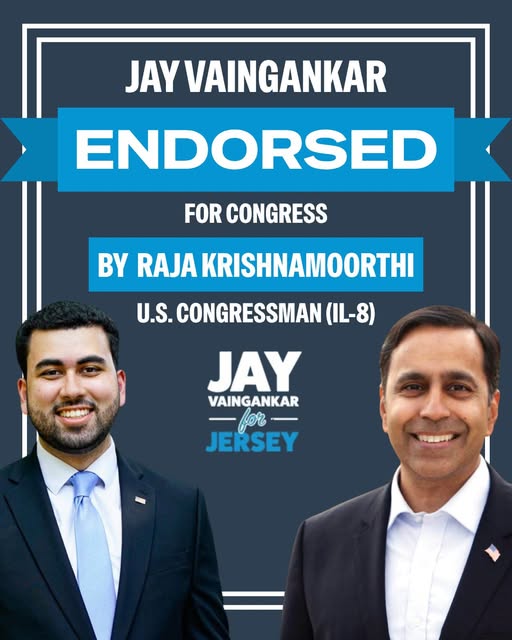 Congressman Raja Krishnamoorthi, D-Illinois, announced April 13, 2026, he is endorsing Jay Vaingankar for Congress (JayVaingankar.com) in New Jersey’s 12th District, backing the Gen Z candidate and former Biden White House official as a “results-driven leader.”