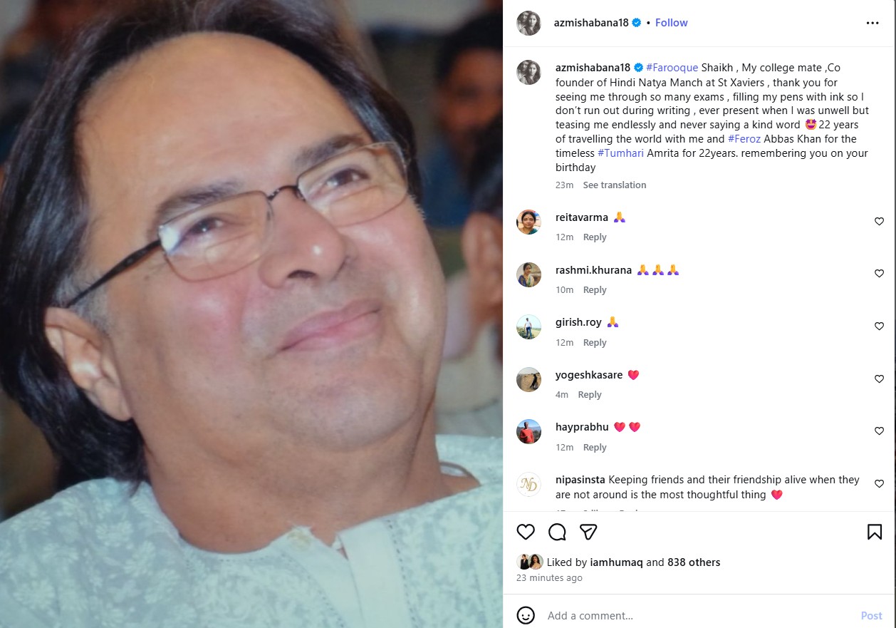 “Farooque Shaikh , My college mate ,Co founder of Hindi Natya Manch at St Xaviers , thank you for seeing me through so many exams , filling my pens with ink so I don’t run out during writing , ever present when I was unwell but teasing me endlessly and never saying a kind word 22 years of travelling the world with me and #Feroz Abbas Khan for the timeless #Tumhari Amrita for 22years. remembering you on your birthday,” Shabana posted.