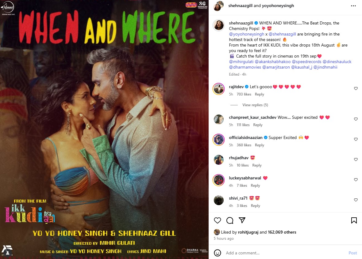 “WHEN AND WHERE…..The Beat Drops, the Chemistry Pops! @yoyohoneysingh x @shehnaazgill are bringing fire in the hottest track of the season! From the heart of IKK KUDI, this vibe drops 18th August are you ready to feel it? Catch the full story in cinemas on 19th sep,” her post read.