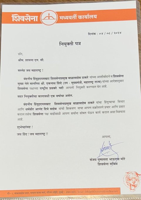 Shiv Sena posted on X, “with the blessings of Dharmaveer Guruvarya Anand Dighe Saheb, and by the order of Shiv Sena Chief Leader and Deputy Chief Minister Hon. Shri. Eknathji Shinde Saheb, Smt. Shaina N.C. is being appointed as the ‘National Spokesperson of the Shiv Sena Party.’ Heartfelt congratulations and best wishes from the Shiv Sena Party!”