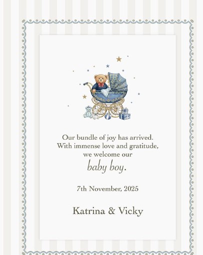 “Our bundle of joy has arrived. With immense love and gratitude, we welcome our baby boy. 7th November, 2025. Katrina & Vicky,” the note read.
