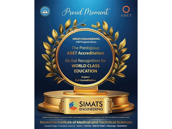 Chennai (Tamil Nadu) [India], September 2: Saveetha Institute of Medical and Technical Sciences (SIMATS), Chennai, proudly announces that its Computer Science and Engineering (CSE) program at SIMATS Engineering has been awarded the highest level of international recognition from ABET (Accreditation Board for Engineering and Technology, USA), the world’s leading accreditor for college and university programs.
