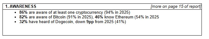 Even among non-investors, crypto’s ubiquity is clear: Bitcoin leads by a wide margin, with 98% awareness, followed by Ethereum at 42%, Dogecoin at 30%, and stablecoins at 19%.