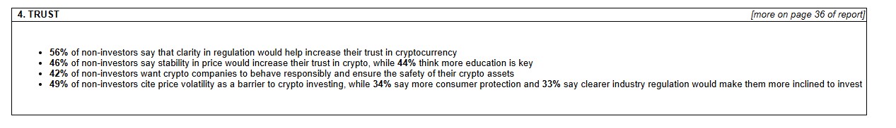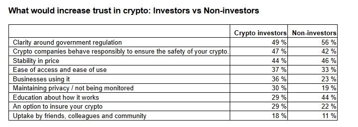Singapore’s crypto trust gap is also shaped by experience. Non-investors look for regulation (56%), price stability (46%), and education (44%).