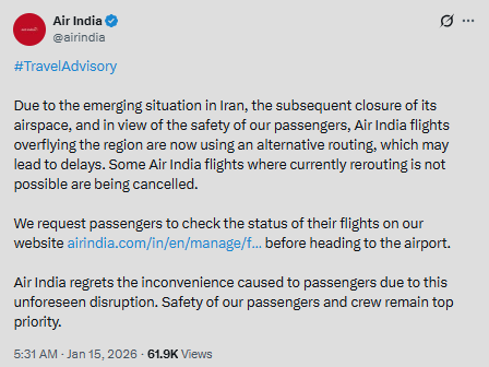 The advisory read, “Due to the emerging situation in Iran, the subsequent closure of its airspace, and in view of the safety of our passengers, Air India flights overflying the region are now using an alternative routing, which may lead to delays. Some Air India flights where currently rerouting is not possible are being cancelled.”