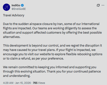 In a travel advisory, IndiGo wrote, “Due to the sudden airspace closure by Iran, some of our international flights are impacted. Our teams are working diligently to assess the situation and support affected customers by offering the best possible alternatives.”