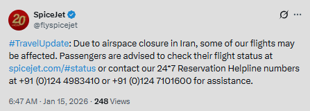 “Due to airspace closure in Iran, some of our flights may be affected. Passengers are advised to check their flight status at https://t.co/2wynECZugy or contact our 24*7 Reservation Helpline numbers at +91 (0)124 4983410 or +91 (0)124 7101600 for assistance,” the advisory stated.