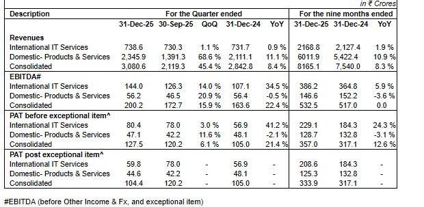 “International IT Services delivered steady progress during the quarter, with consolidated PAT improving significantly in the last two quarters. Following a 10% PAT growth in the previous quarter, we achieved a further 6.1% quarter-on-quarter growth in the current quarter. The business secured a large deal in the BFSI vertical with a Fortune 500 fintech client, reinforcing our strategy of driving growth through large deals backed by disciplined execution. Our continued strategic investments in Artificial Intelligence contributed approximately 14% of the overall order book for the quarter.”