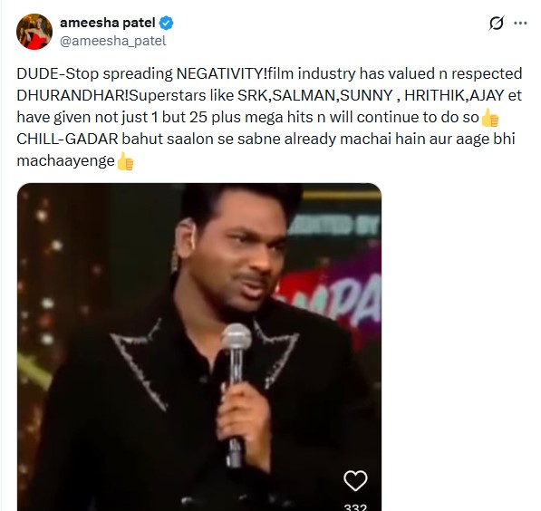 “DUDE-Stop spreading NEGATIVITY!film industry has valued n respected DHURANDHAR!Superstars like SRK,SALMAN,SUNNY , HRITHIK,AJAY et have given not just 1 but 25 plus mega hits n will continue to do so CHILL-GADAR bahut saalon se sabne already machai hain aur aage bhi machaayenge,” Ameesha Patel posted on her X.