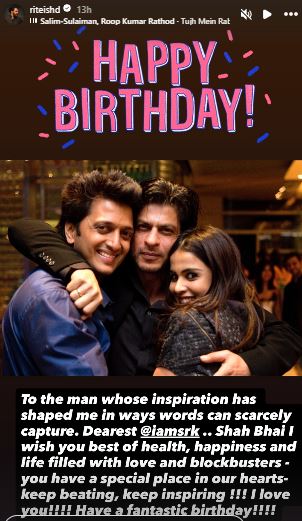 Actor Riteish Deshmukh shared an old picture, showing him with SRK and Genelia and wrote, “To the man whose inspiration has shaped me in ways words can scarcely capture. Dearest @iamsrk..Shah Bhai I wish you best of health, happiness and life filled with love and blockbusters – you have a special place in your hearts – keep beating, keep inspiring!!! I love you!!!! Have a fantastic birthday!!!!”