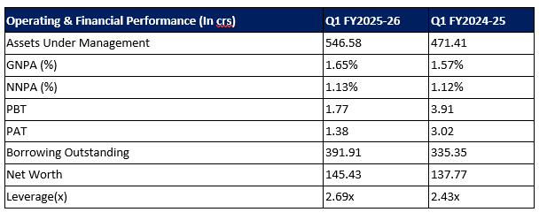 Asset Quality: PAR (0+ days past due) stood at 5.18 %, of which GNPA stands at 1.65 % and NNPA stands at 1.13 % as of June 30, 2025