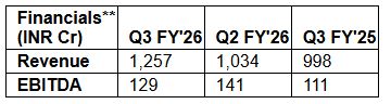 Mumbai (Maharashtra) [India], January 23: STL (NSE: STLTECH), a leading connectivity solutions provider for AI-ready digital infrastructure, today announced its financial results for the quarter ended 31st December 2025. For Q3 FY’26, the Company reported revenues of INR 1,257 Cr and EBITDA of INR 129Cr, a YoY growth of ~26% and ~16%, respectively.